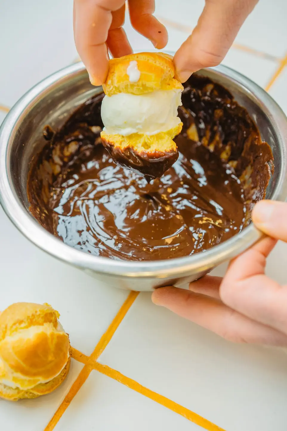Profiteroles, tiramisu en ICE ICE AMY ijs - deze creatie heeft het allemaal. Knapperige koffiesoesjes met een dakje van cacao gevuld met luxueus Italian Tiramisu ijs die de frisse romigheid van mascarpone combineert met de warme, zachte smaak van amaretto. De kers op de taart : een beurre-noisette karamelsaus verrijkt met een intense espresso smaak.