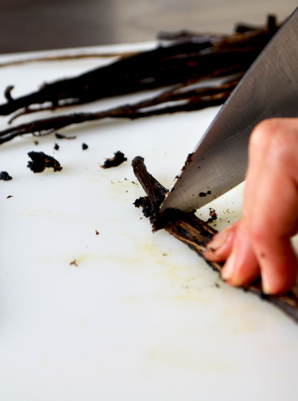 Eenmaal bij ons aangekomen, worden de vanillestokken één voor één met de hand opengesneden en zorgvuldig uitgeschraapt. De glanzende, zwarte zaadjes mengen we met verse room, die we langzaam laten infuseren. De tijd doet hier zijn werk: de room neemt de geur, warmte en diepte van de vanille volledig in zich op.